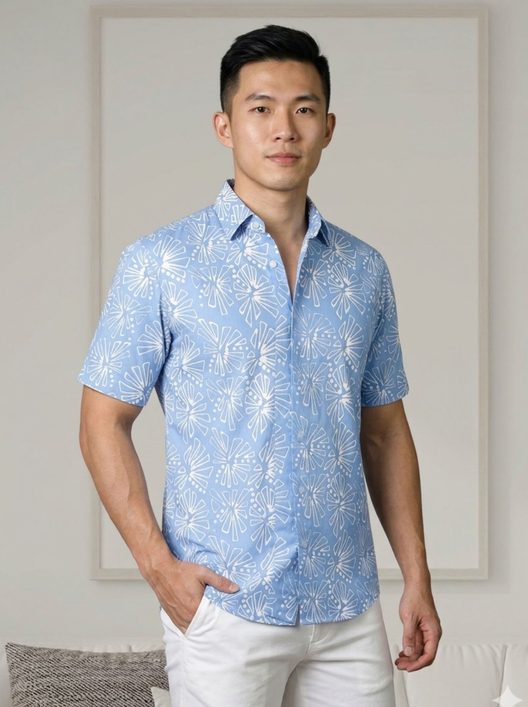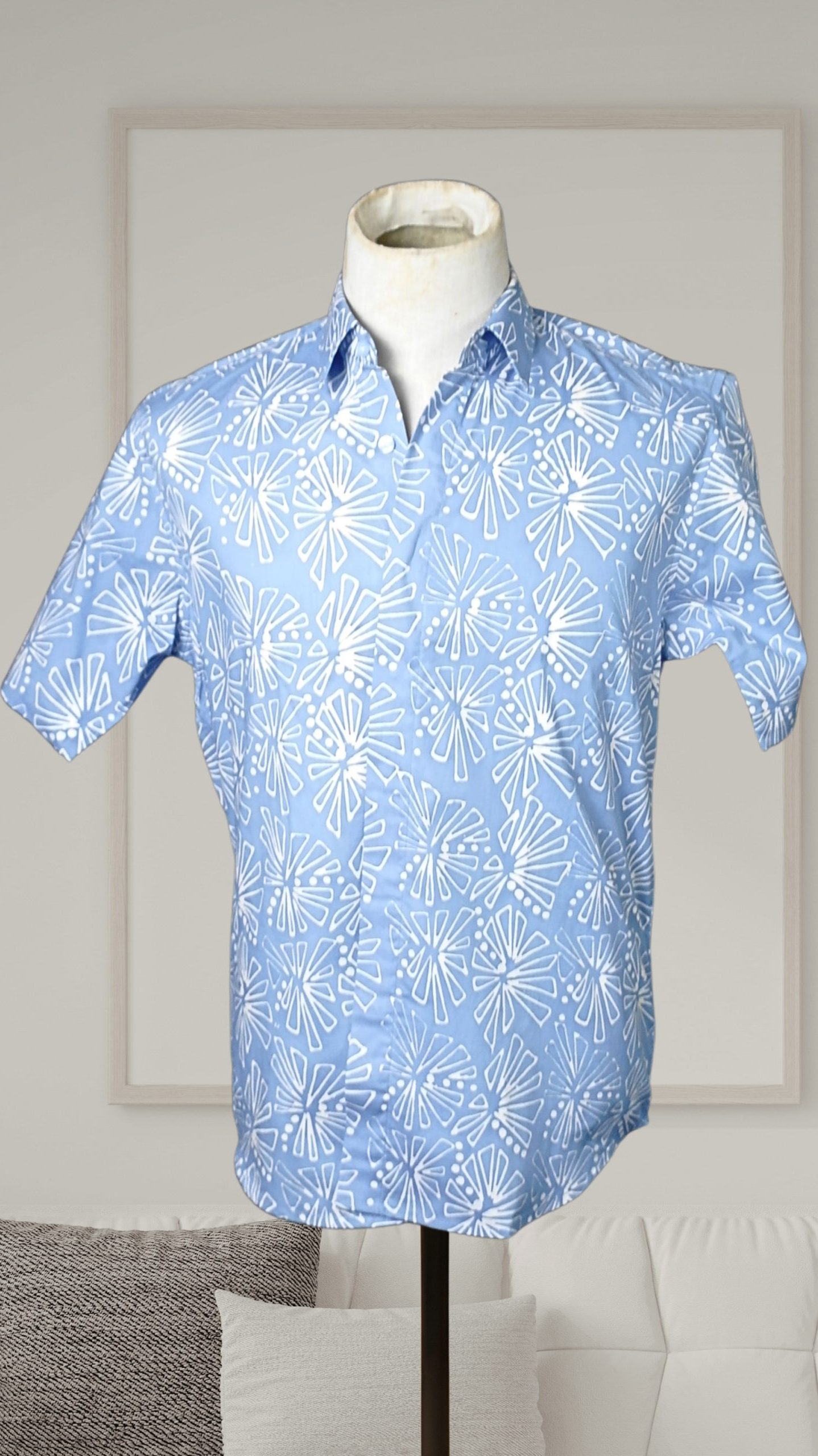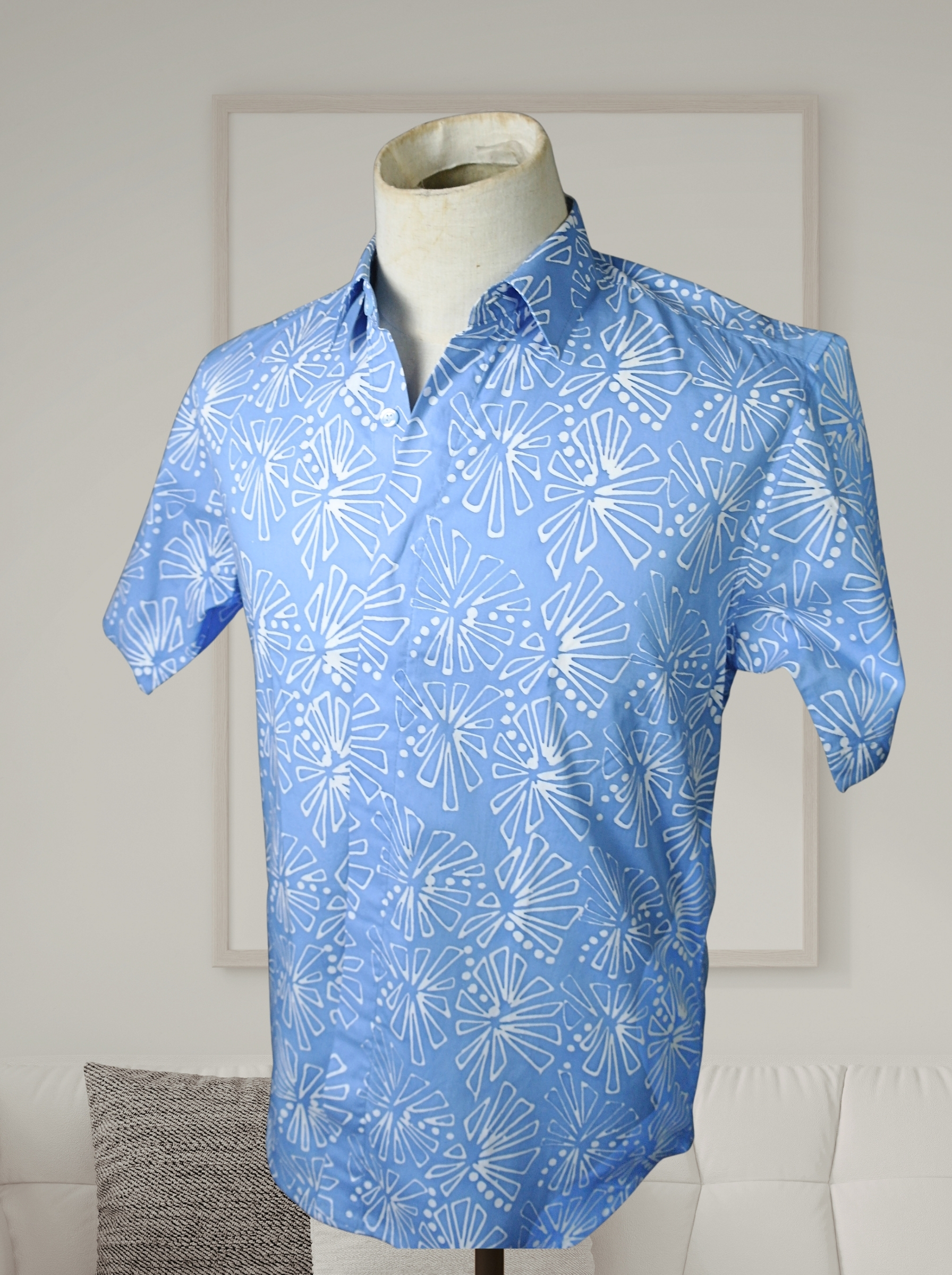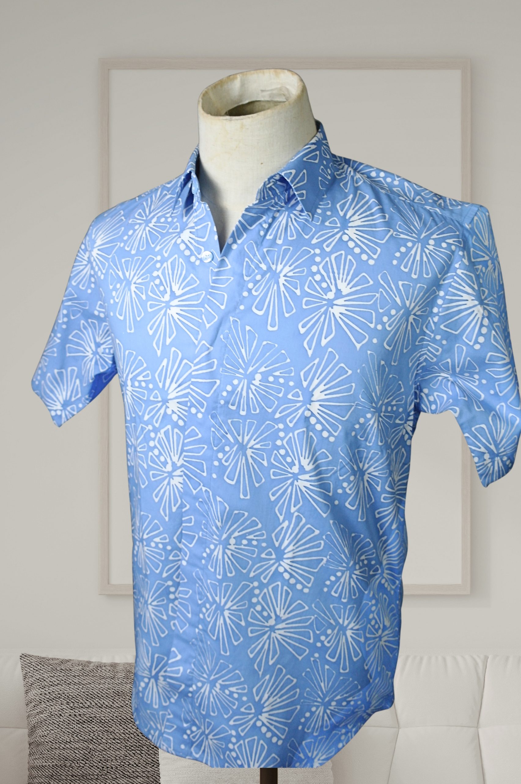 This is a short-sleeved men’s shirt made using batikTEKTURA’s original batik fabrics that are produced in Selangor, using batik terap (handblocked) techniques. Stay cool and comfy in this 100% cotton shirt.